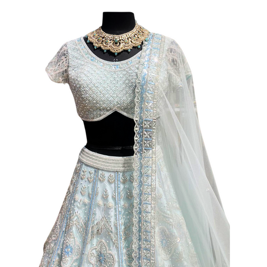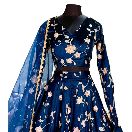 Traditional Indian Simple Banarasi Blue Lehenga with Tissue Dupatta